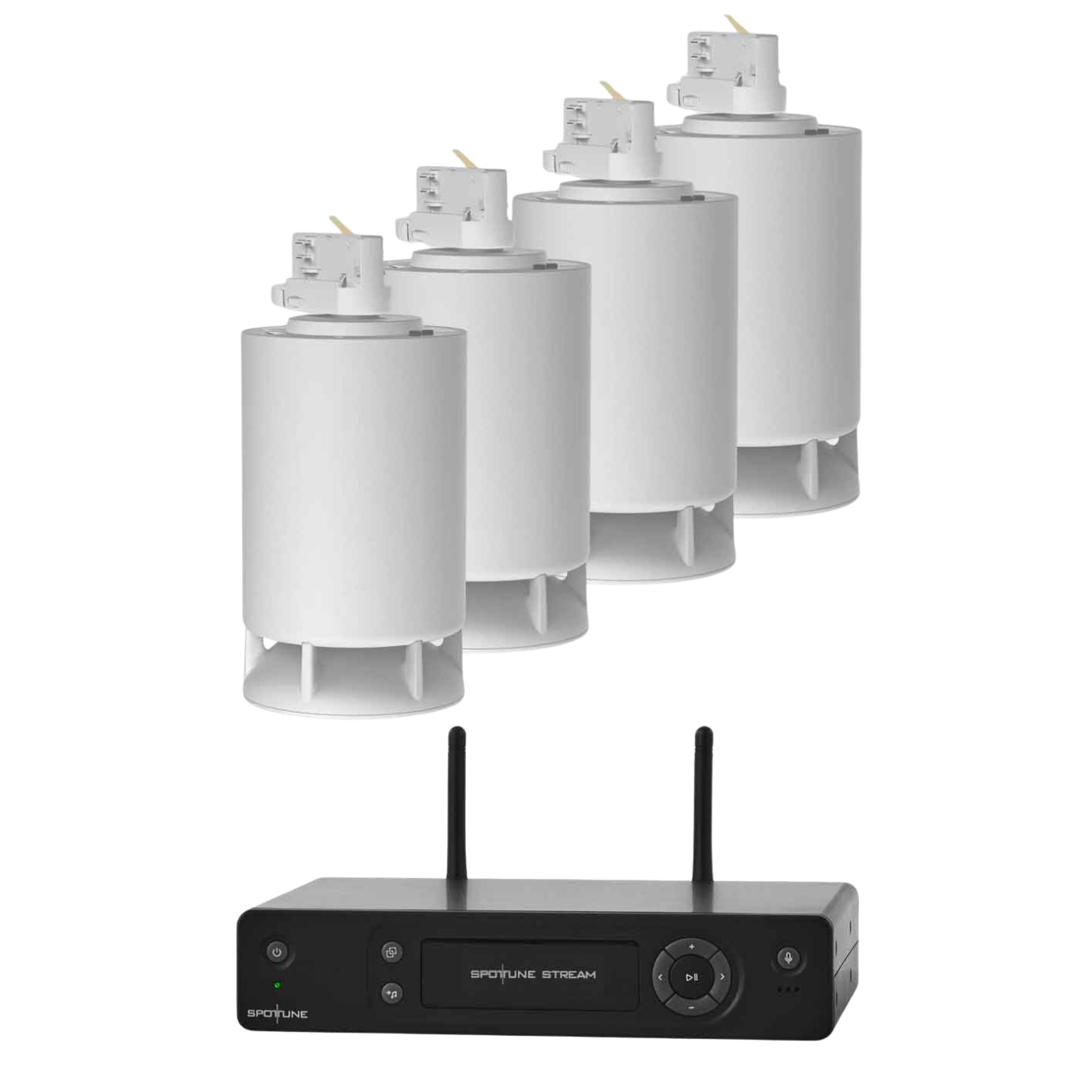 Sistema de audio inalámbrico para instalación en riel, Spottune, OMNI TRACK Blanco x 4 + 1 Sub, vista frontal